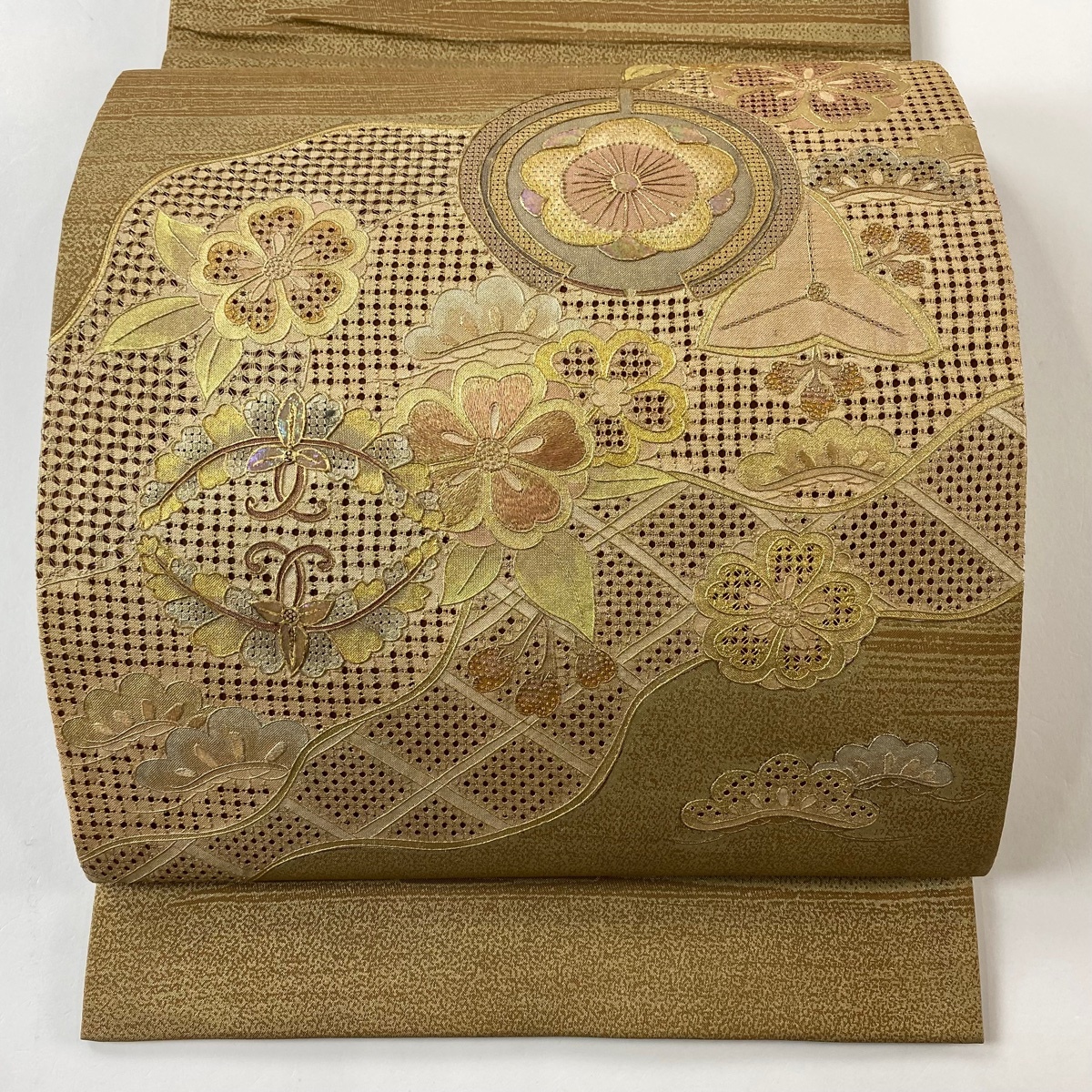 - 袋帯 名品 草花 松 螺鈿 刺繍 山吹茶色 お太鼓柄 正絹 【中古】