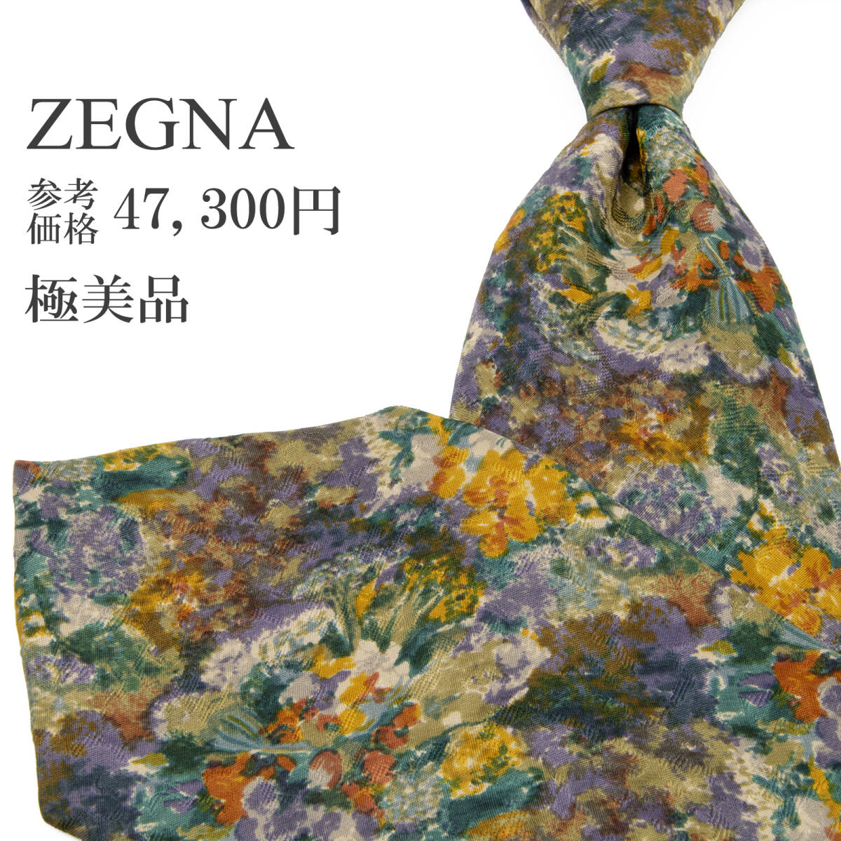 > 送料無料 ゼニア ネクタイ ジャガード シルク グリーン 黄緑色 紫 グレー 黄色 オレンジ 花 植物 Y2K 00s ブランド イタリア製 綺麗 P521