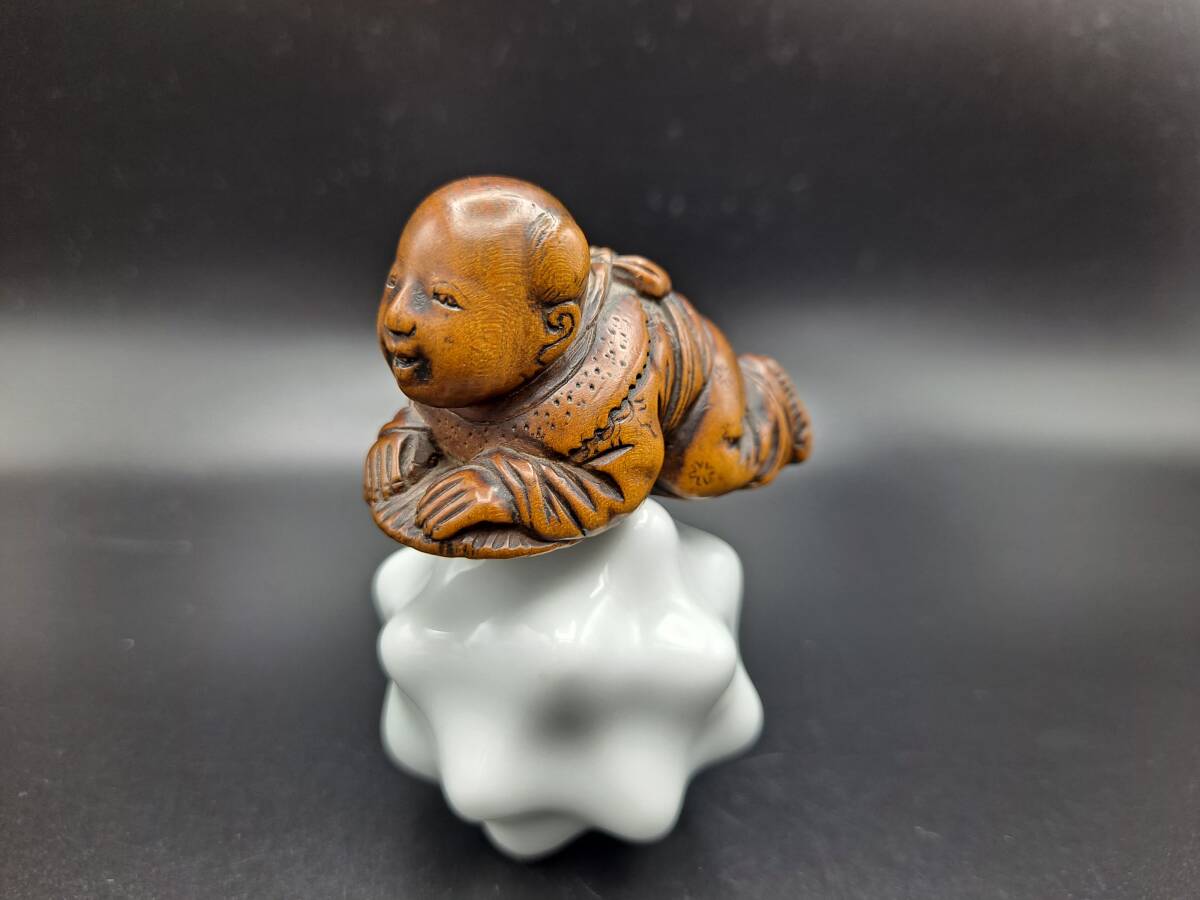- 【2】19世紀〜「団扇上の唐子」意匠 初代「民谷」銘 黄楊根付 江戸派 古色