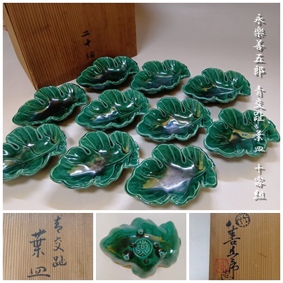 - 【T-487】永楽善五郎 青交趾 葉皿 十客組 共箱付 茶懐石 訳あり