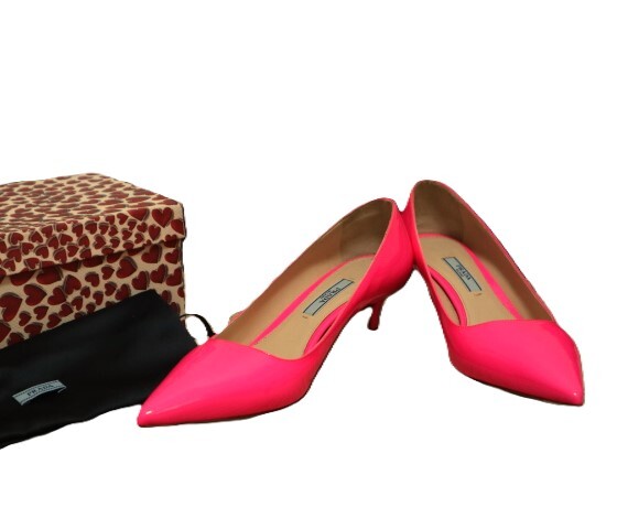 > 【即決】良品 短時間使用 PRADA プラダ◆保存袋 お箱付 フィッシャーピンク パテント ヒール パンプス 37.5 日本サイズ24~24.5㎝位 yu