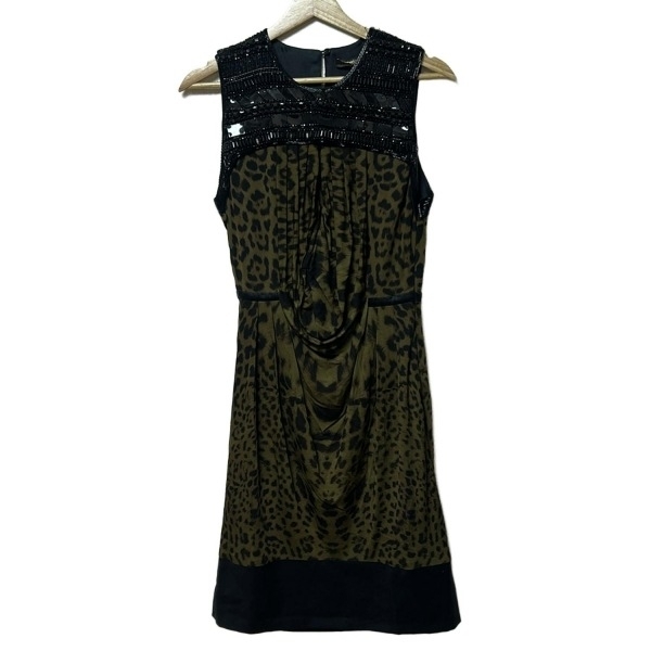 > ロベルトカヴァリ RobertoCavalli ドレス サイズ38 M - カーキ×黒 レディース クルーネック/ノースリーブ/ひざ丈/ビーズ/ビジュー/豹柄