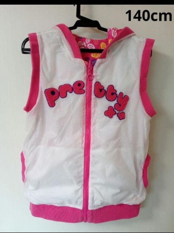 - 女の子リバーシブルフード付きベスト 140cm コットン ホワイト/ピンク 子供服