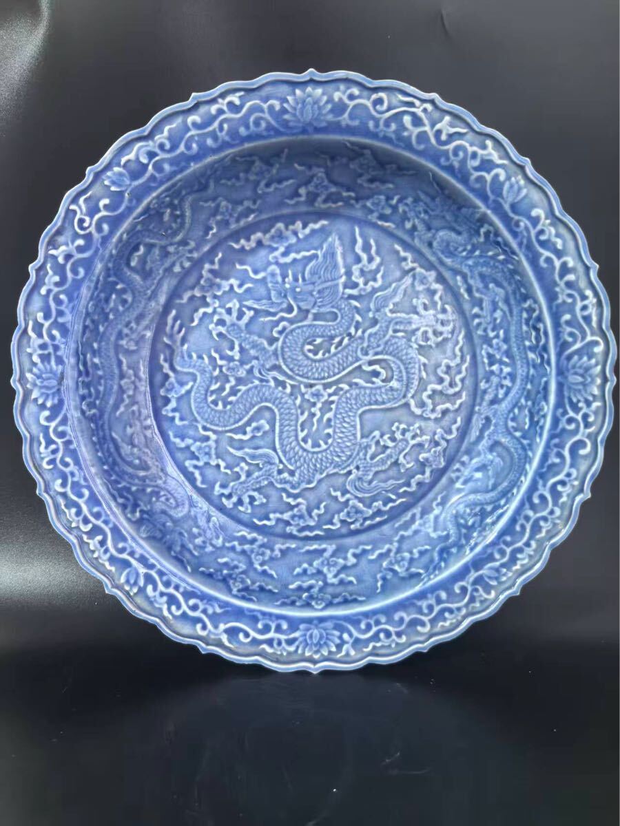 - 【竹華】中国古美術 明時代 藍釉 龍紋 皿 古玩 骨董 時代物 当時物 唐物 骨董品 時代品 美術品 茶道具 置物 js3