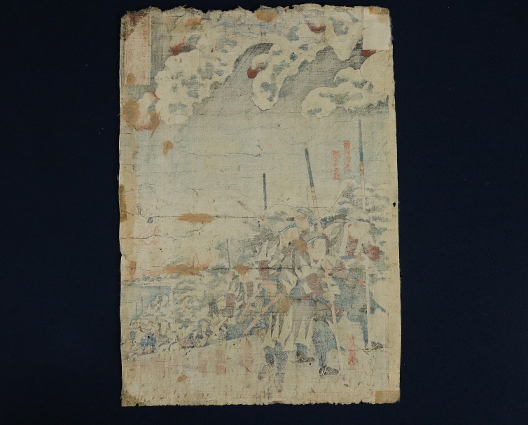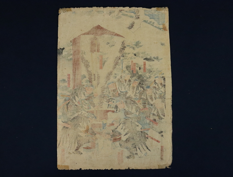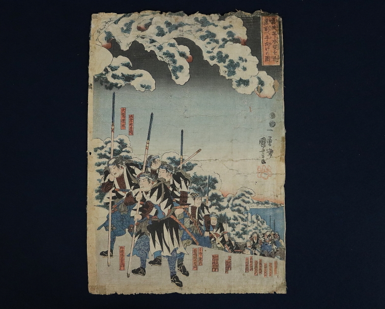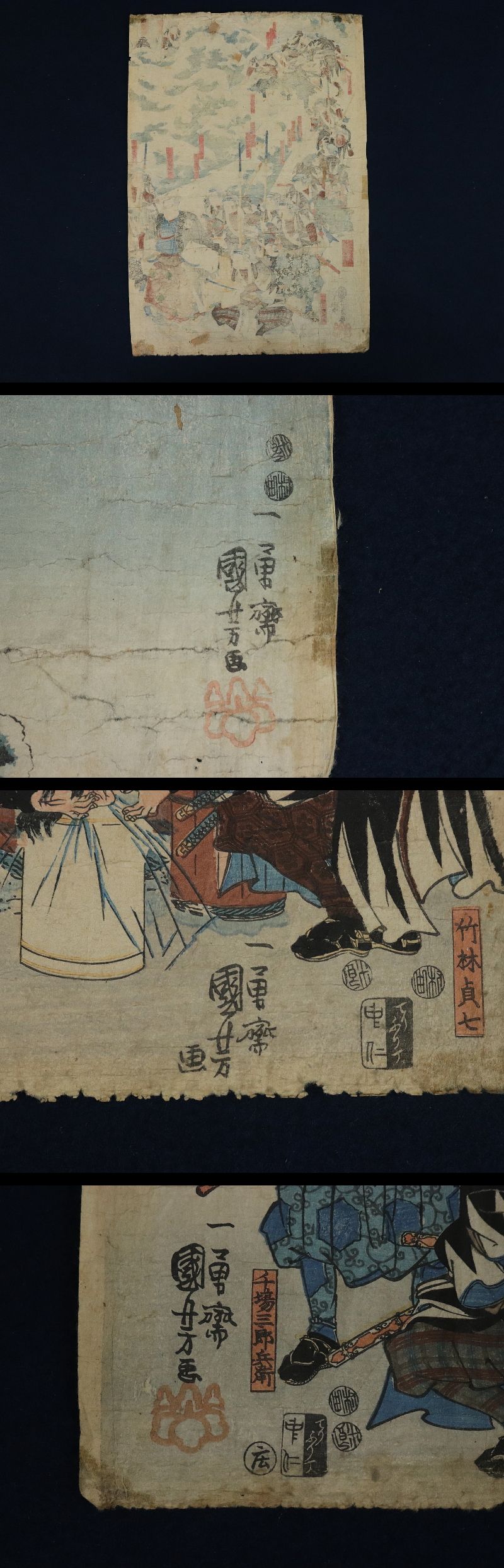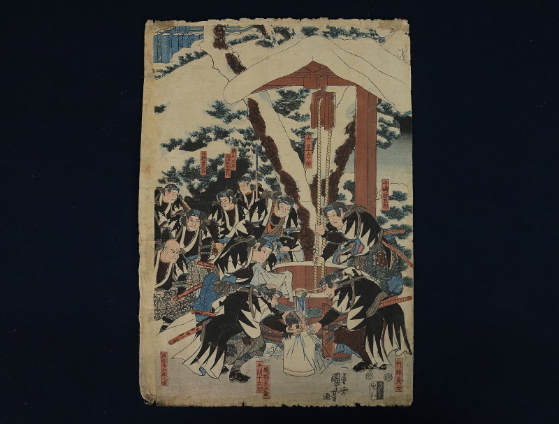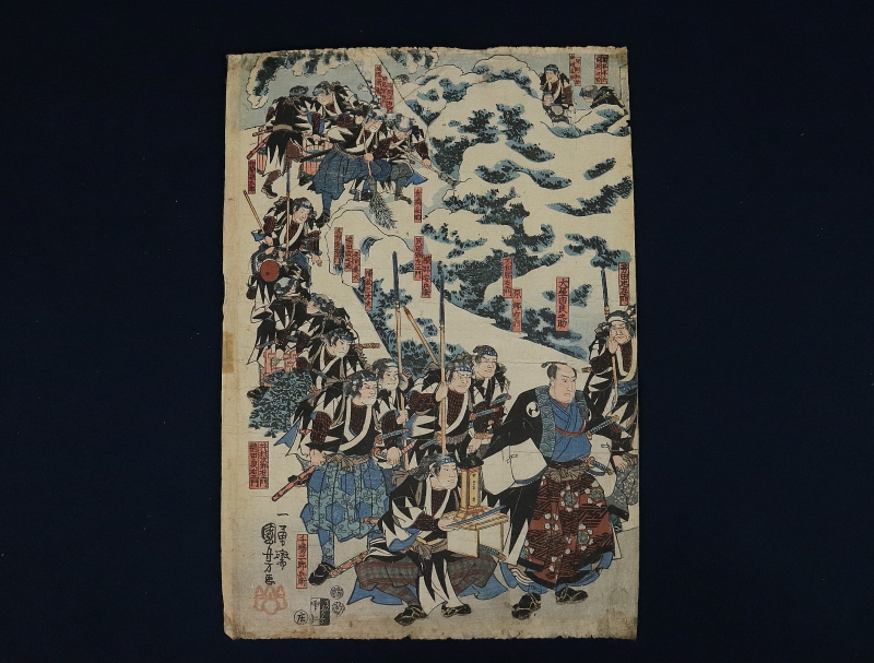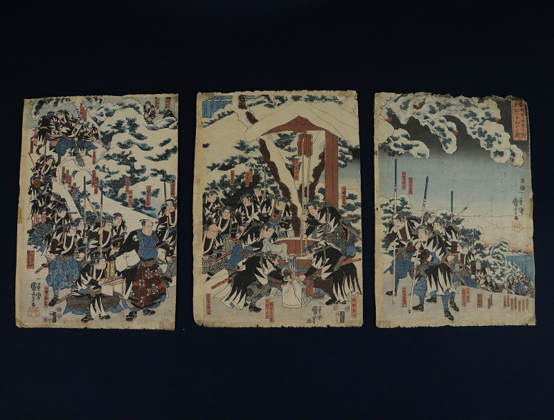 - 11037■【真作】歌川国芳 三枚続 「義徒等本望を遂墓前へ手向けの図」 木版 忠臣蔵 赤穂事件 浮世絵 江戸末期 マクリ