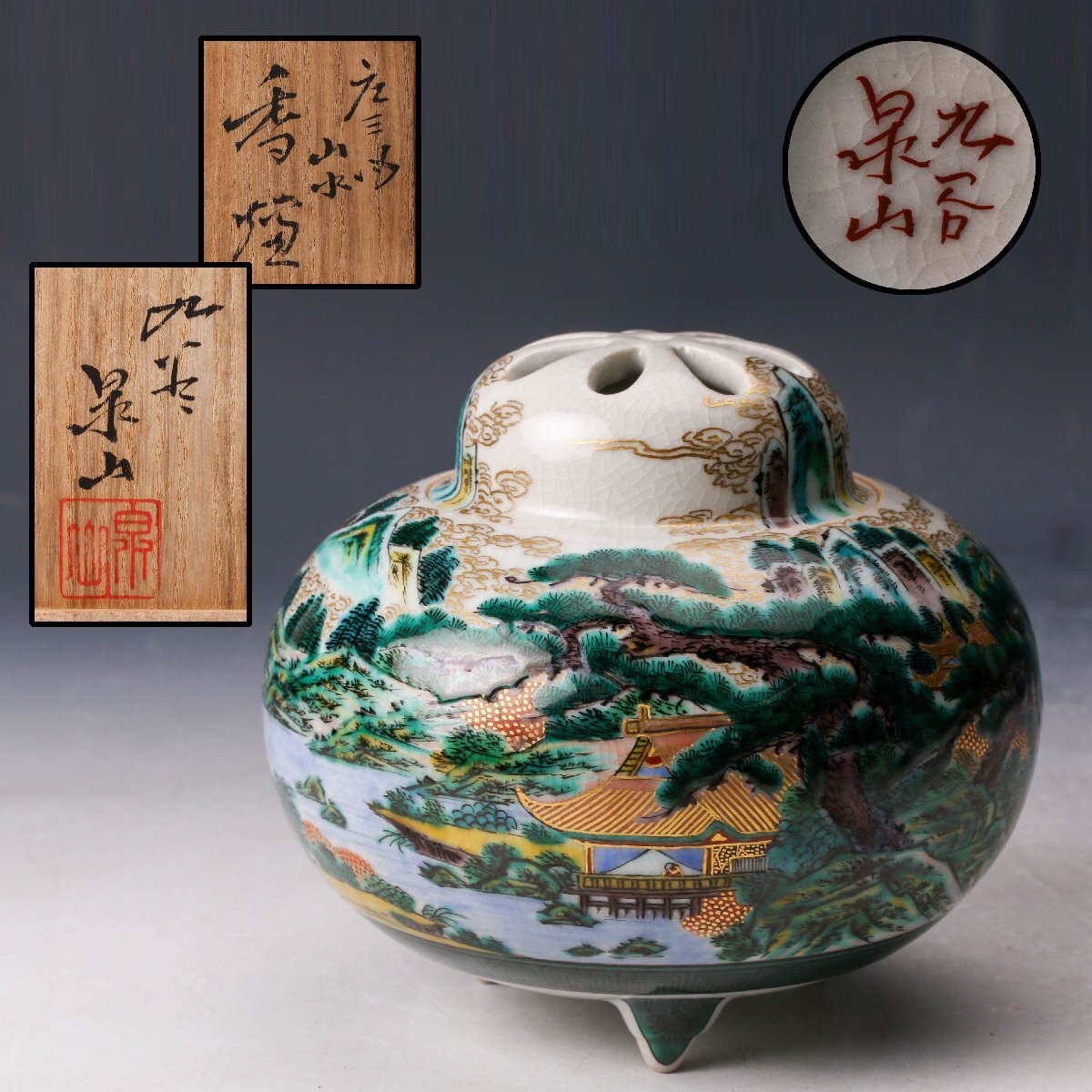 【佳香】末川泉山 九谷焼 庄三風色絵山水図香炉 共箱 茶道具 本物保証