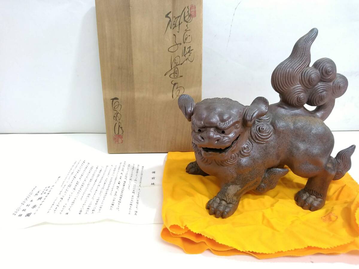 - 【うぶだし】備前焼 興楽園 友敬 木村純雄 造 獅子置物/約22×22×13cm/重量約1.5kg/在銘/狛犬/縁起物/置き物/栞 共布 共箱付き/LHP36-10