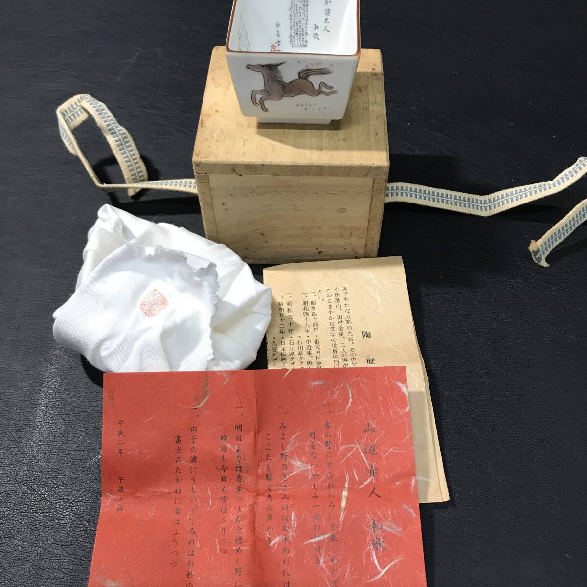 - ZA186 九谷焼 ぐい呑み 三代目 田村敬星作 細筆細字 山辺赤人 和歌 午画
