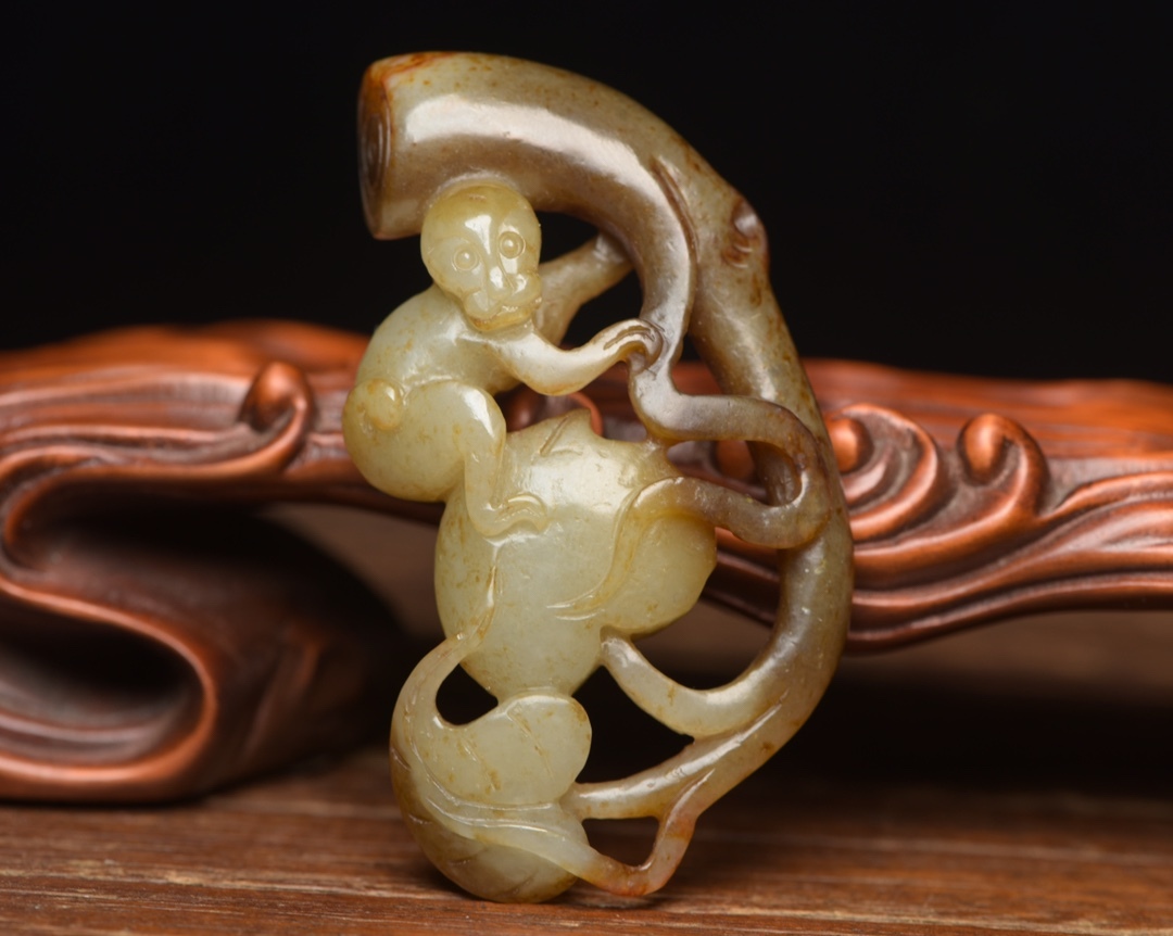- 【超珍館蔵】和田玉製 細密彫 靈猴獻壽 置物 賞物 古賞物 古董品 古美術品 時代物 旧家蔵出 稀少珍蔵品
