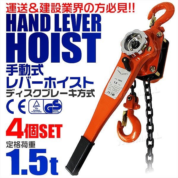 - 【4個セット】レバーホイスト 定格荷重1.5t 1500kg チェーンホイスト 荷締め機 ジャッキ ガッチャ チェーン ブロック CE TUV認証済 玉掛け