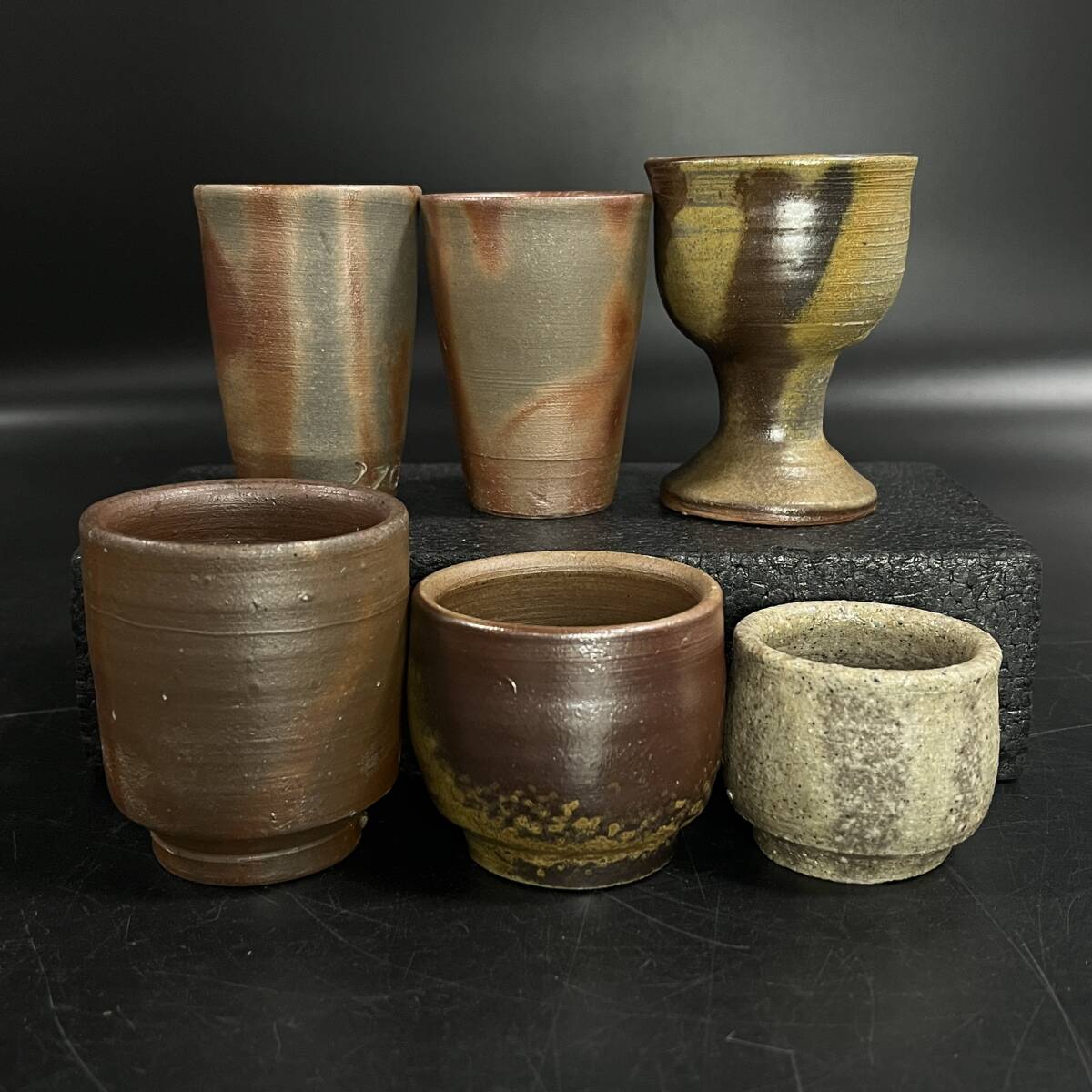 > 【20100V】未使用 備前焼 岡本徹正造 銘印在 掻き銘 ぐい呑み 6点 猪口 盃 酒器 経年保管品 現状品