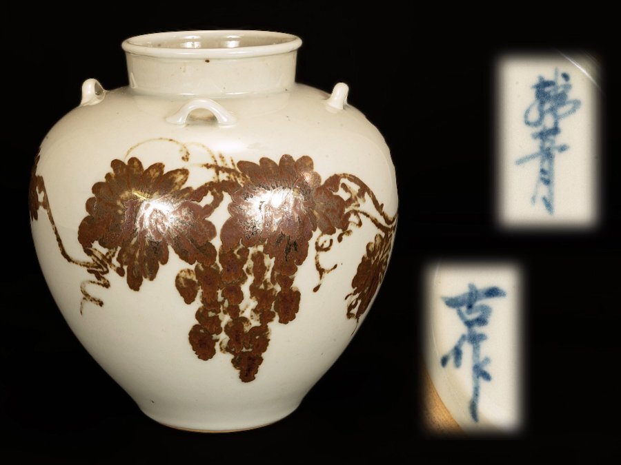 ●古作 鉄絵 葡萄文 四耳瓶 壺 花瓶●拍卖