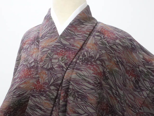 > 《京都一輝堂》【着物】 小紋 単衣 ちりめん 草花文 身丈約155.5cm 裄丈約60cm 25z05-2466