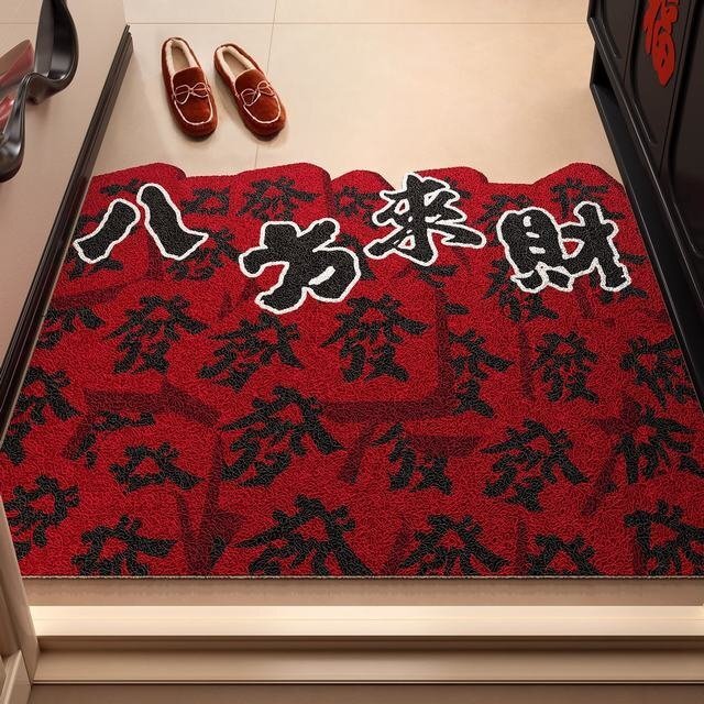 - 麻雀柄 發 高密シルクリング 商売盛 泥除け カット自由 新居祝い 玄関マット 60×90cm 八方来財(赤)