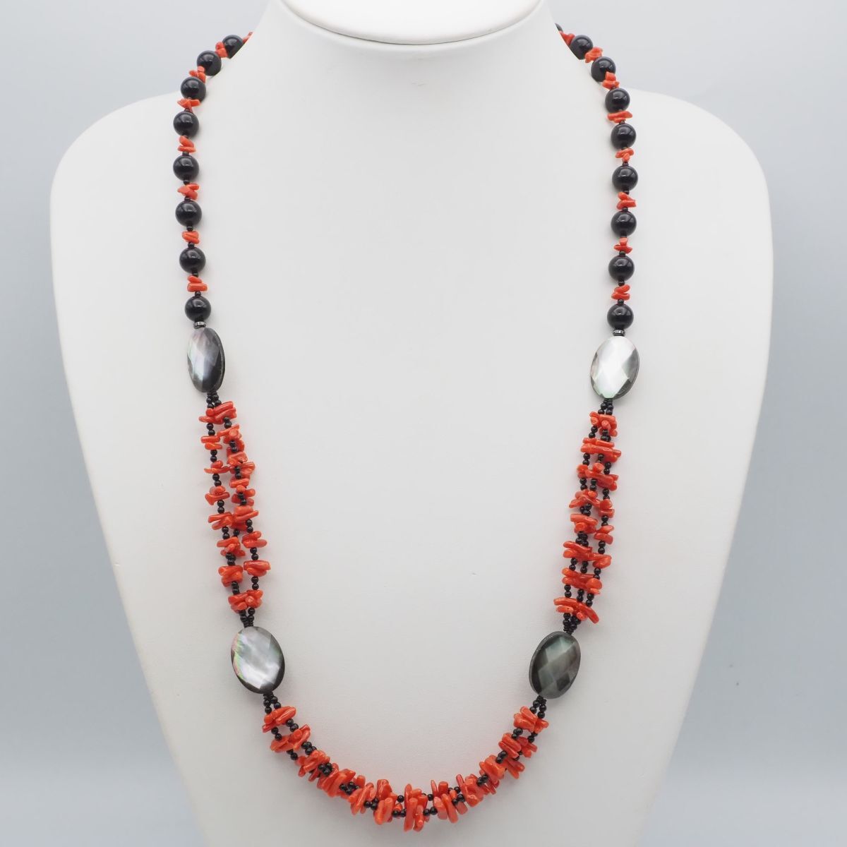 > G369 赤珊瑚 サンゴ シェル オニキス SILVER刻印 ネックレス 3連 デザイン シルバー 3月誕生石