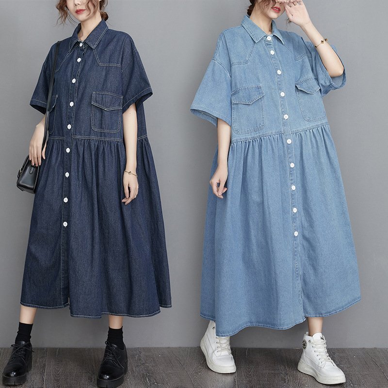 > ZJM959 *体型カバー*デニム*ギャザーゆったり大きいサイズ*半袖ロングシャツワンピース* 新品春夏*レディース*カジュアル
