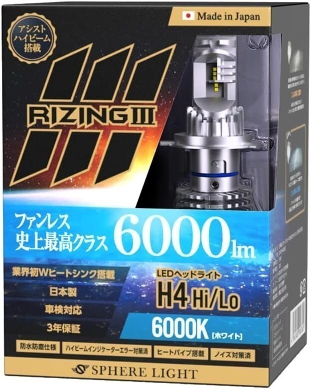 > 3年保証 スフィアライト ライジング3 RIZING3 H4 Hi/Lo 12V用 6000K ファンレス 日本製 LED ヘッドライト 6000lm 車検対応 SLRZH4A060