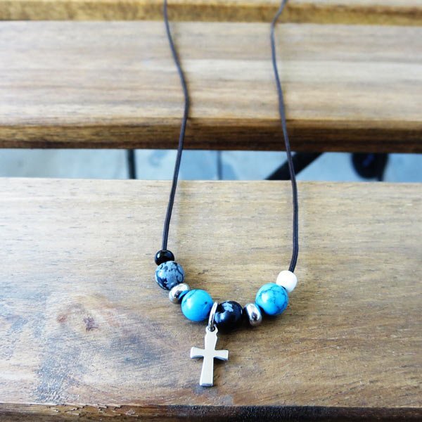 - 革紐細めネックレス チョーカー 染めターコイズ オブシディアンフレーク ミニクロスチャームつき ステンレス金具 BN01