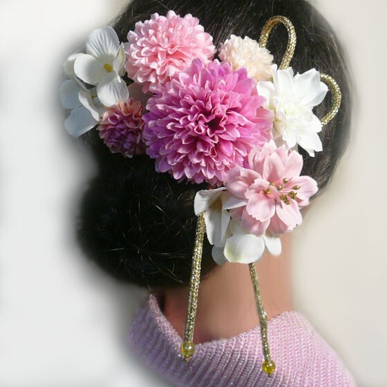 - 髪飾り 成人式 卒業式 花 菊と桜ミニダリア紐付き ピンクpi 振袖 袴 浴衣 かんざし マム(1)(2)