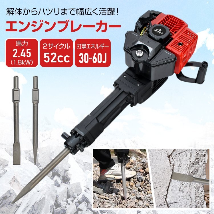 - 送料無料 エンジンブレーカー エンジン式 ブレーカー はつりハンマー ジャックハンマー 2サイクル 2種アタッチメント付 排気量52cc wk022