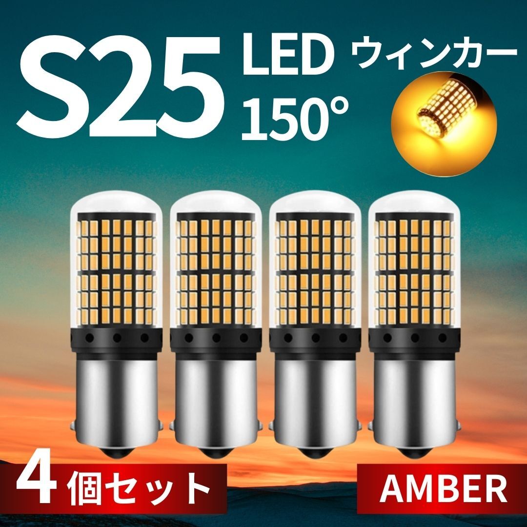 - S25 LED ウインカー バルブ アンバー 4個セット 150°度 ピン角違い シングル BAU15s 150° ハイフラ防止抵抗 内臓 オレンジ 12V SMD 144連