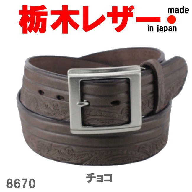 - チョコ 栃木レザー ムラ染め サイドカービング 型押し 8670 牛革 ベルト 日本製
