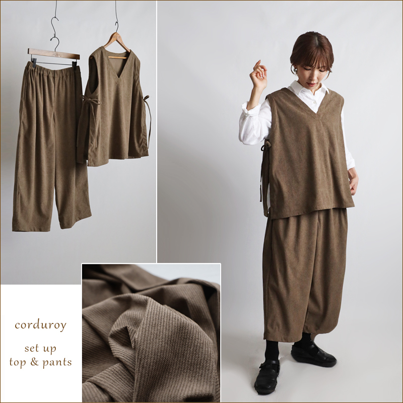 - 秋の新作 コーデュロイ生地 上下 セットアップ サイド横リボン付き ベスト 幅広 ストレート パンツ ブラウンK32
