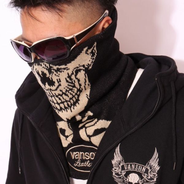 > 当店別注 VANSON リバーシブルネックウォーマー ロング NVNW-502 ブラック×アイボリー バンソン ボーン スカル 髑髏 ハーレー 防寒(3)