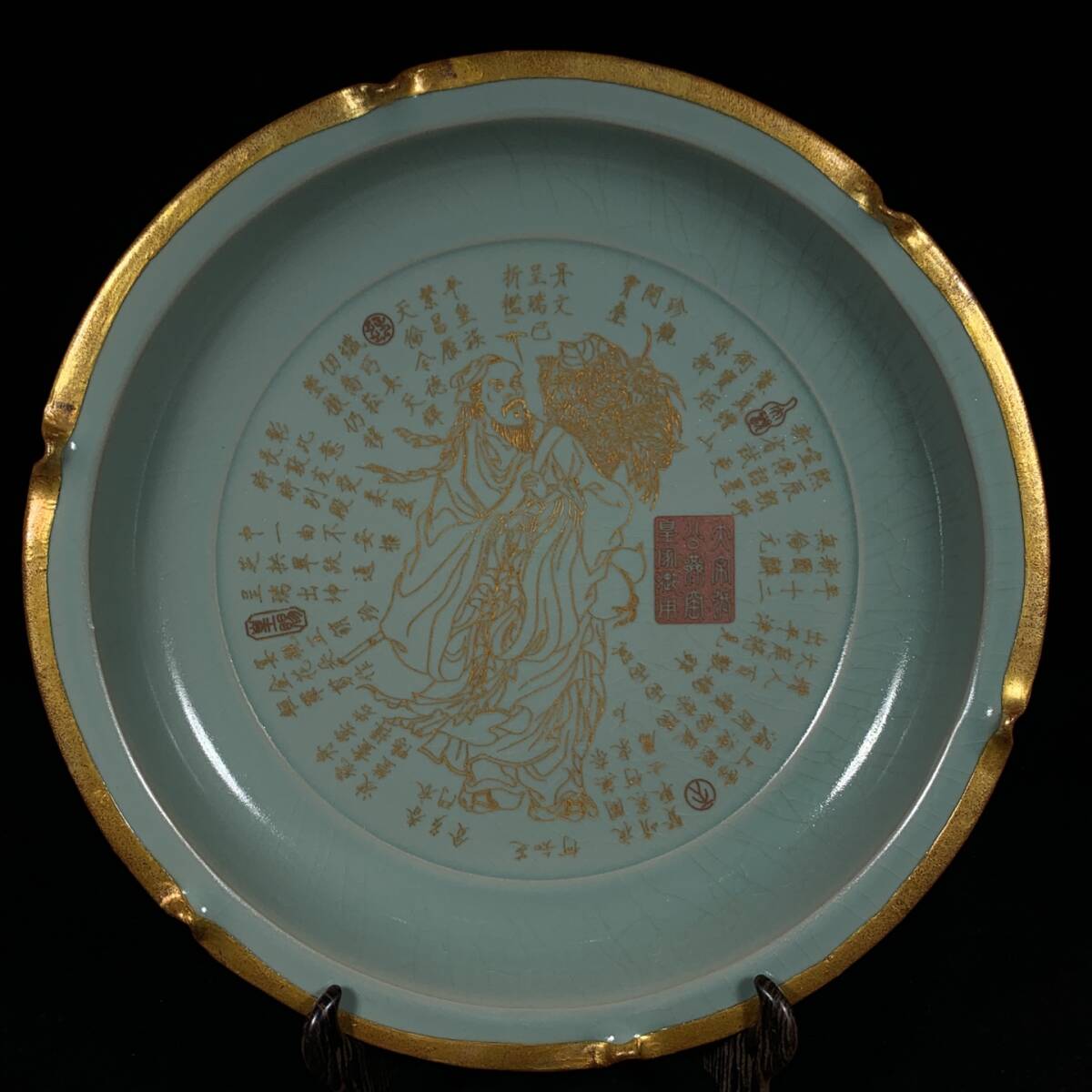 > 旧 宋 汝窯 包口銘文 彫刻人物紋 花口皿 唐磁 古陶磁器 陶芸 中国古美術 古賞物 古置物 唐物 S710