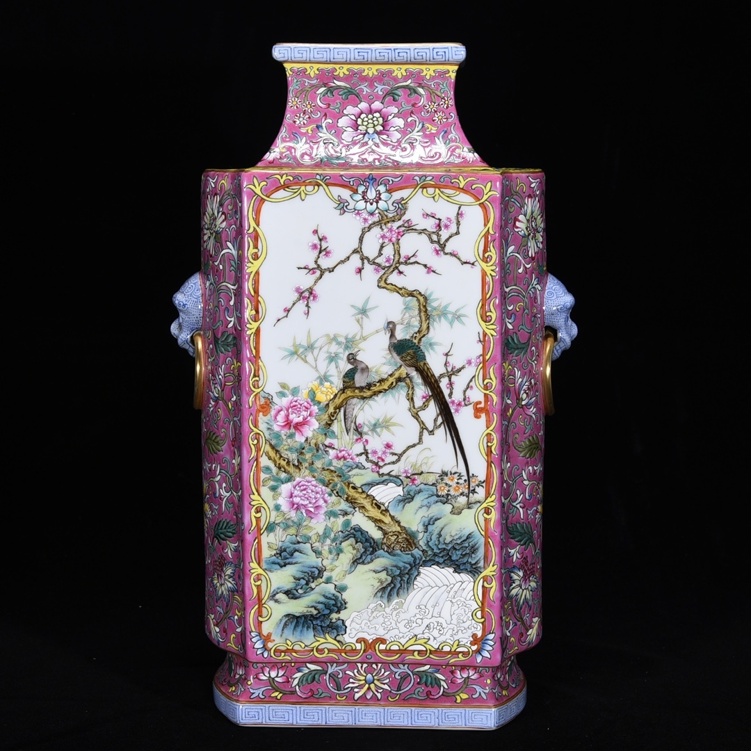 > A_YF0460【惠】人間国宝 中国骨董 陶芸 磁器【清乾隆粉彩臙脂窓開窓花鳥紋獣頭瓶】工芸品 施釉陶 青花磁 陶芸 置物 收藏品