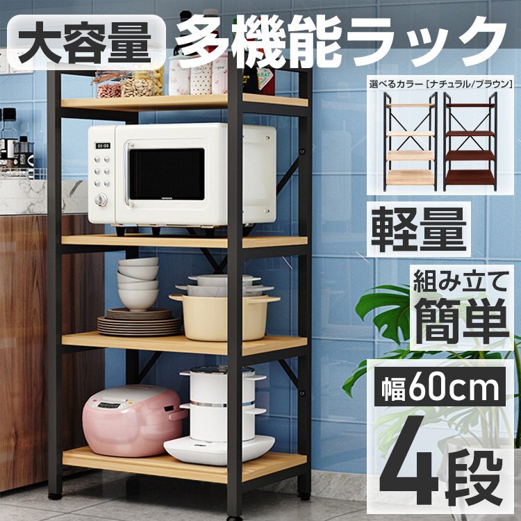 - 多機能ラック 4段 幅60cm キッチンラック レンジ台 ウッドラック オープンシェルフ オープンラック 棚 食器 ラック リビング 収納 ny361