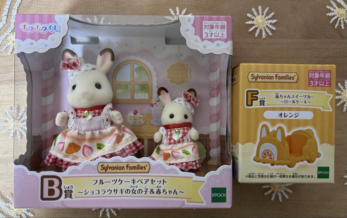 > シルバニアファミリー キラキラくじ B賞 フルーツケーキペアセット ショコラウサギの女の子 F賞 赤ちゃんスイーツカー オレンジ 2点