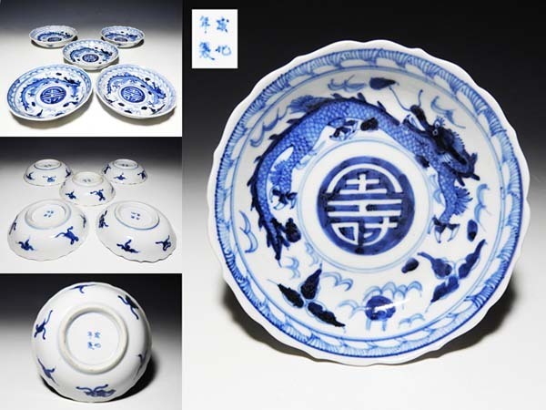 - 【桃】清朝期染付龍の図皿 五枚 成化年製
