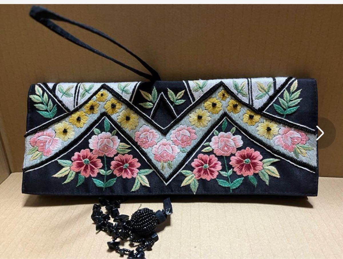 - カイスミルク ブラック ビーズ シルク刺繍 クラッチバッグ 財布 ▼未使用品→破損あり▼ ※画像10、留め具を補修する必要があります※