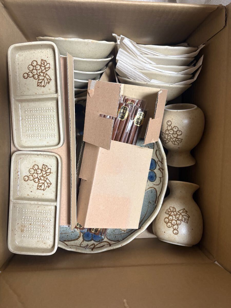 - 蕎麦?天ぷら皿セット ①大皿 約直径25cm×2枚、②小皿 約直径13cm×10枚、③猪口 約高さ10cm×2客、④薬味皿 約15cm、⑤箸 約21.5cm×10客