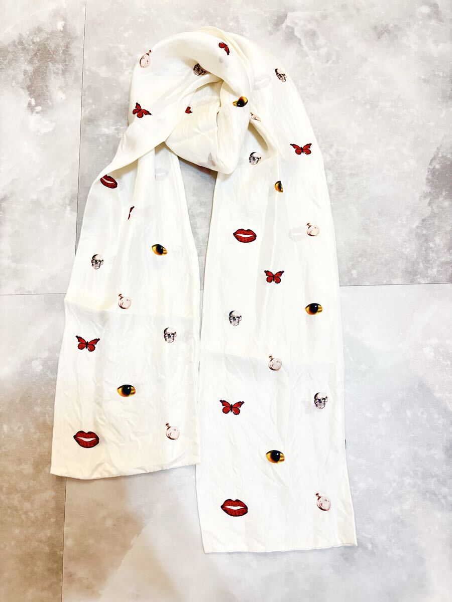 - 蝶々ドクロ個性的デザイン シルクホワイトストール シルク100 ホワイト系