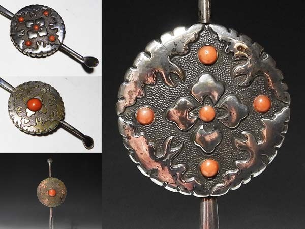 - 【桃】アンティーク髪飾り:金工銀製枝珊瑚透かし彫菊花簪