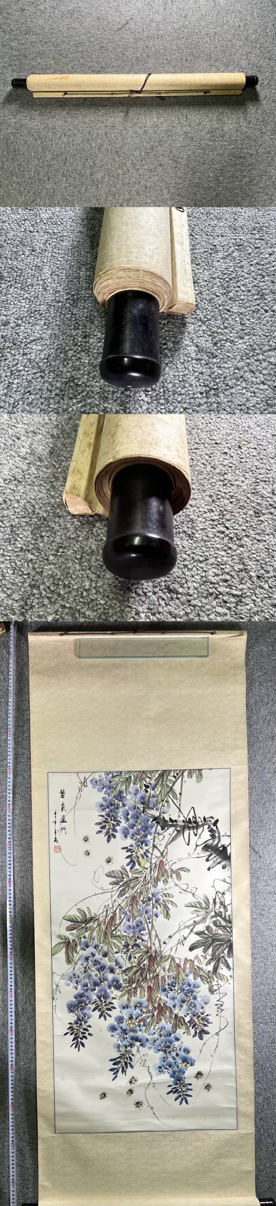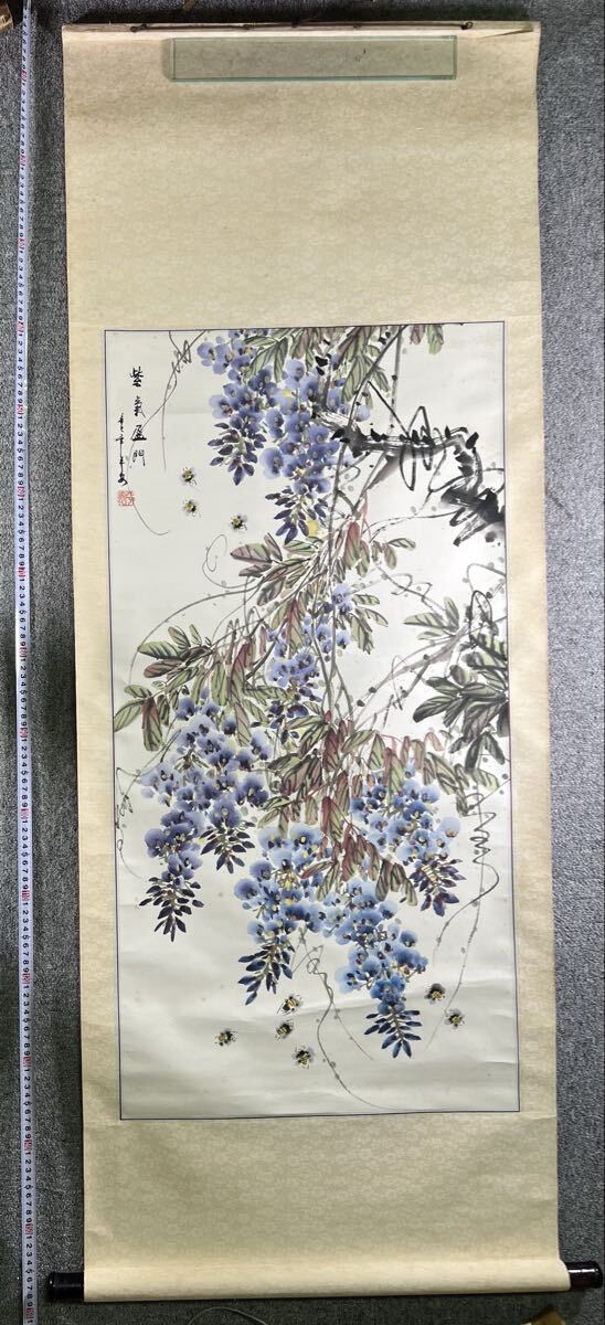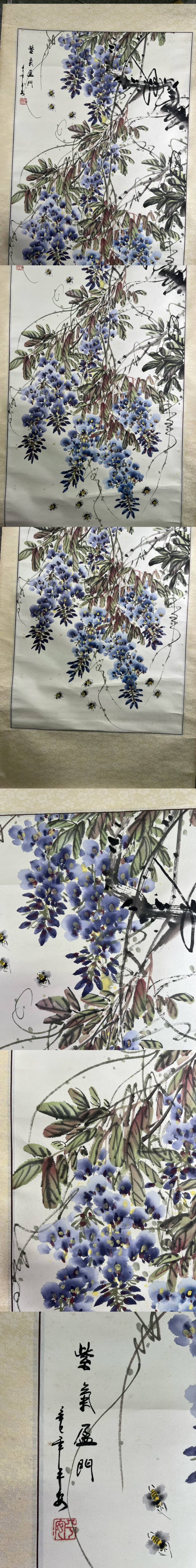 - 紫藤図 掛軸1点、肉筆紙本真作、2001年平安画、美術絵画、和本唐本 花鳥図中国