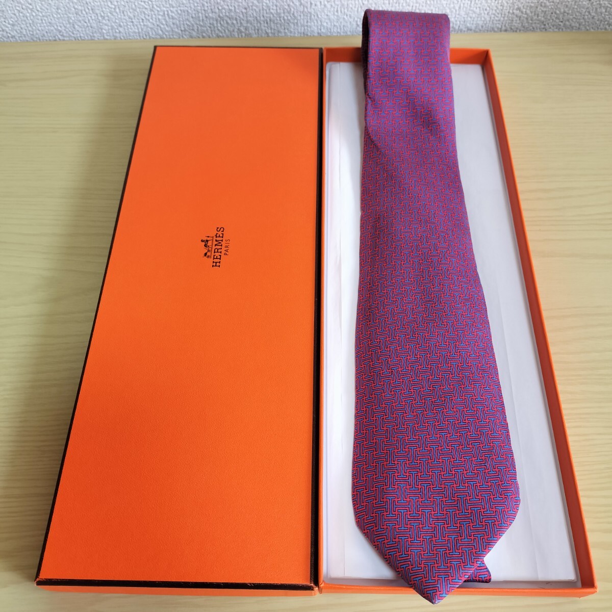 - エルメス(HERMES)青赤立体H柄模様ネクタイ