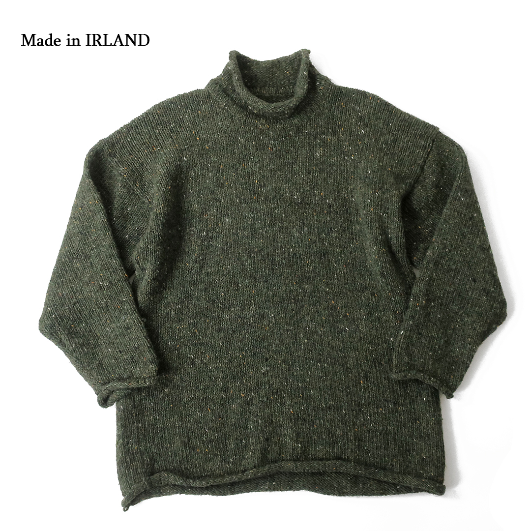 - アイルランド製 手織りニット ハイネックウールセーター カラーネップ入り モスグリーンミックス HAND LOOMED