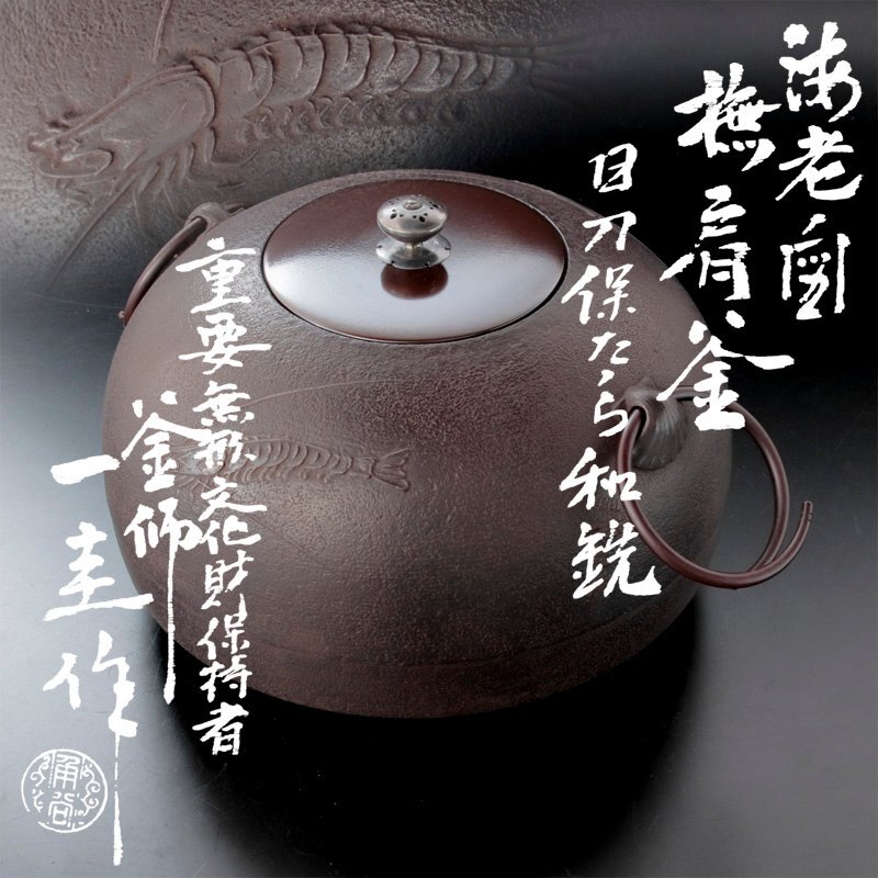 - ★【古美味】人間国宝 釜師 角谷一圭作 海老ノ図撫肩釜 日刀保たたら和銑 茶道具 保証品 bDI5