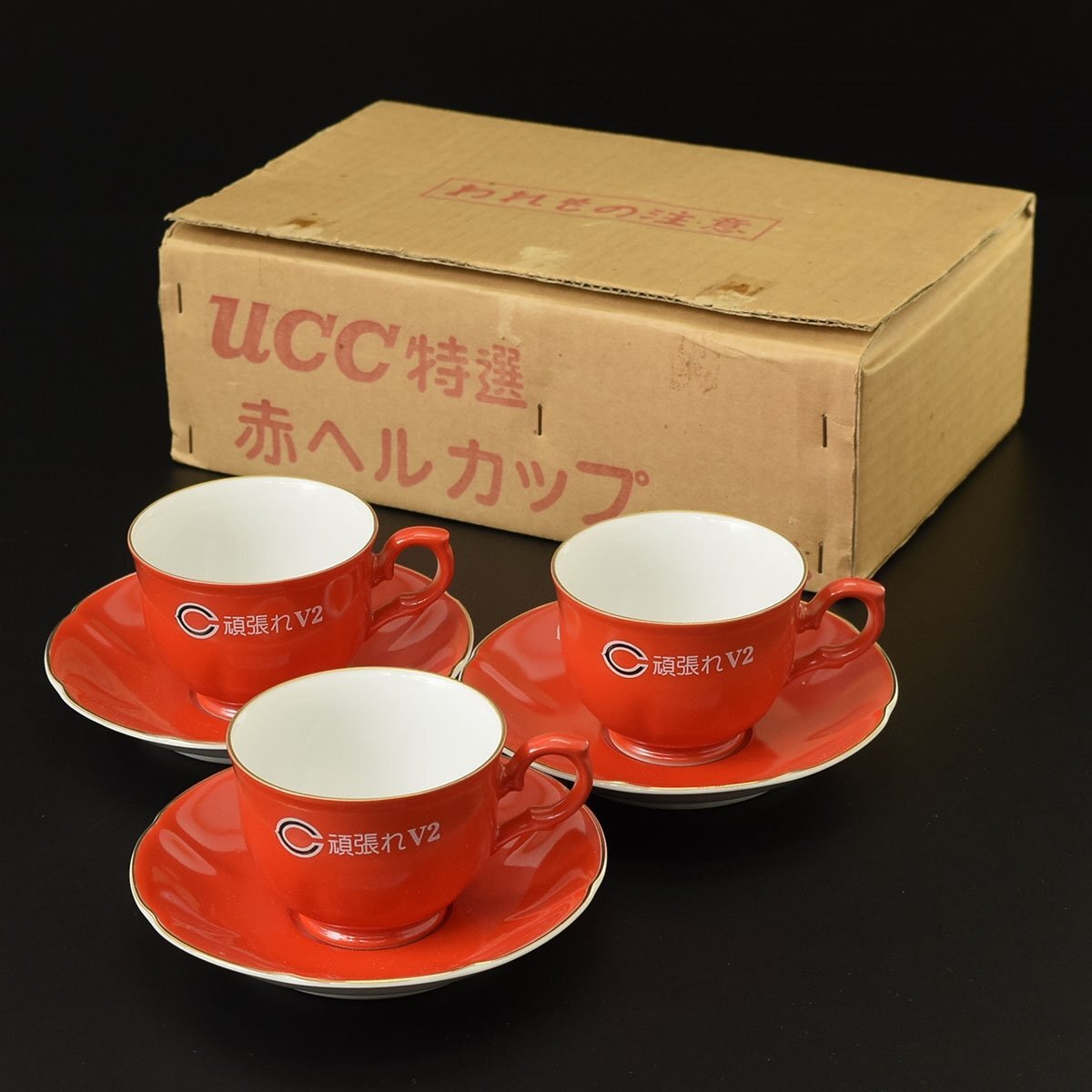 > ◎524620 美品 希少 当時物 広島カープ V2 UCCコーヒー 赤ヘルカップ&ソーサー 3客セット 記念グッズ 昭和レトロ プロ野球