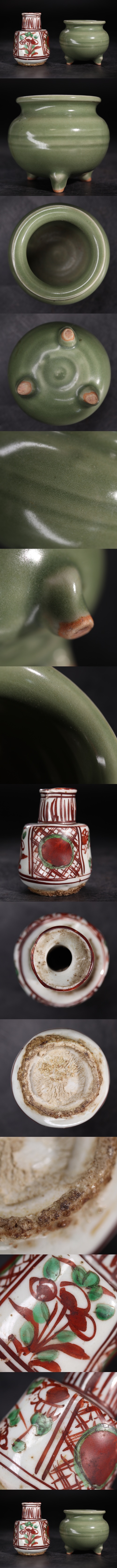 > 時代 青磁 香炉 ・ 赤絵 小壺 / 中国美術 香道具 煎茶道具 検索:龍泉窯 天龍寺 呉須赤絵 南京赤絵 .G2776