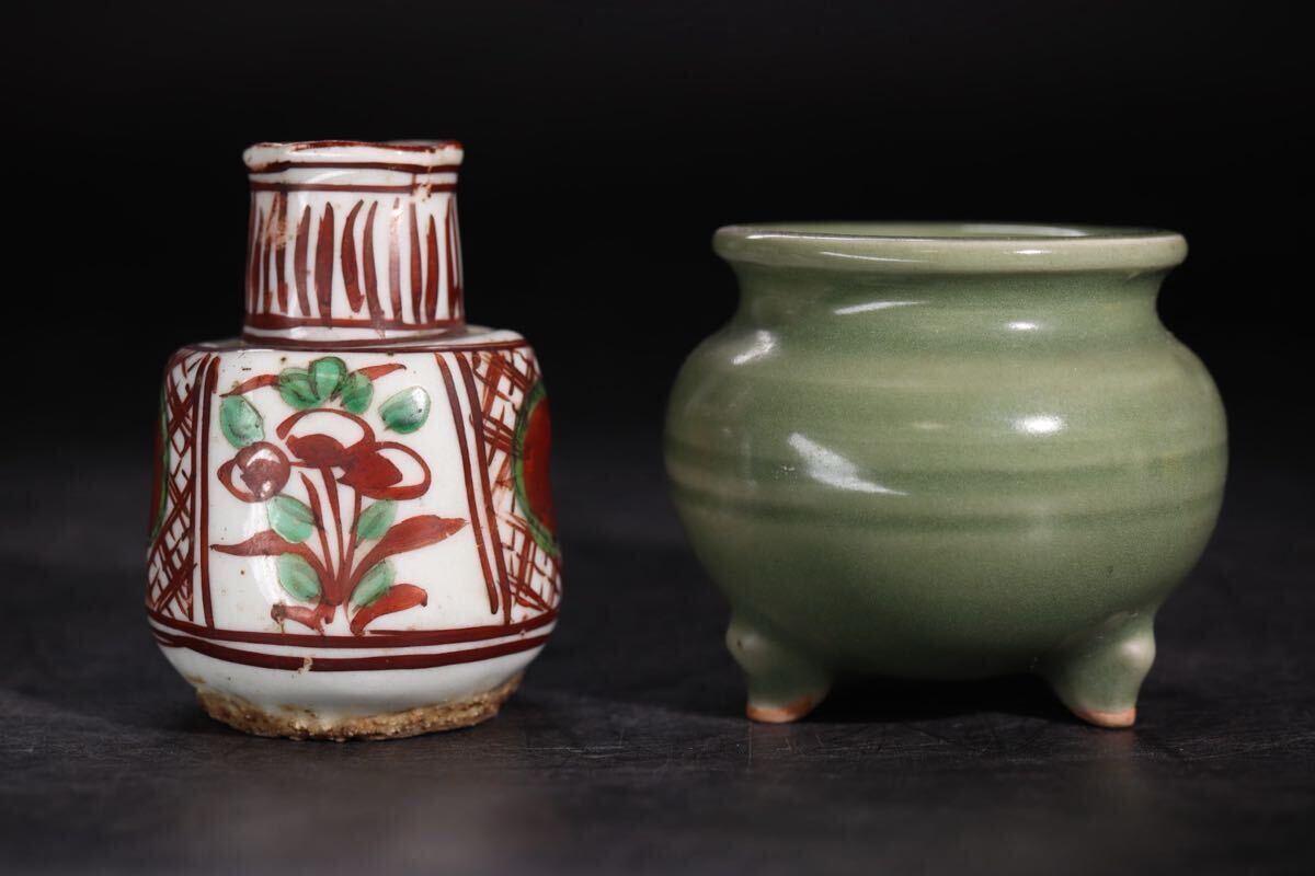 - 時代 青磁 香炉 ・ 赤絵 小壺 / 中国美術 香道具 煎茶道具 検索:龍泉窯 天龍寺 呉須赤絵 南京赤絵 .G2776