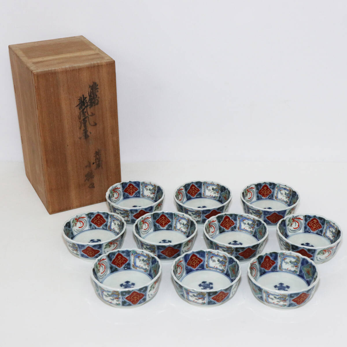 - 十二代目 酒井田柿右衛門 染錦 龍鳳凰画 桔梗 小猪口 10客 共箱 1003-18