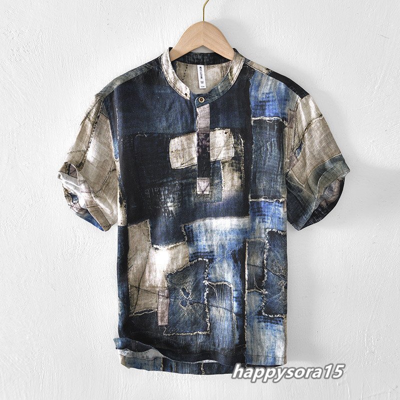 > リネンシャツ メンズ Tシャツ 新品 カジュアルシャツ パッチワーク 落書き アート柄 半袖 トップス ブルー L