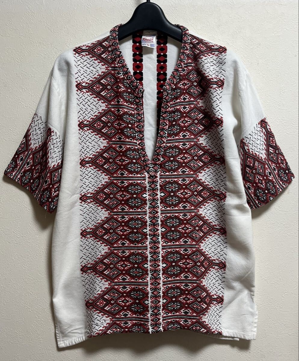 > ギリシャ製 Giras シャツ 3-L(M位)白 プルオーバー 刺繍 半袖 エスニック バイカー ヒッピー ボヘミアン 民族 メキシカン ヴィンテージ