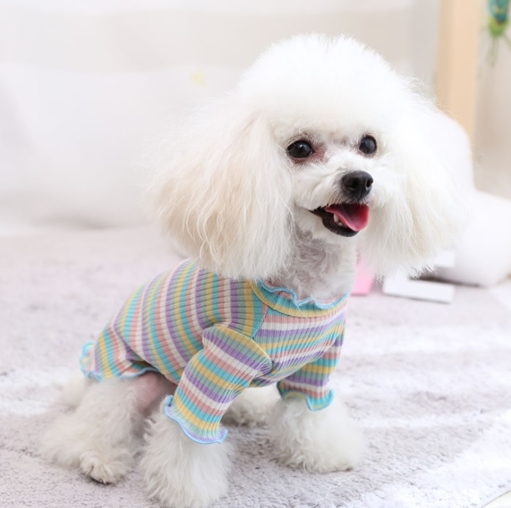 - Mサイズ 緑系 パステルカラー しましま レインボー 淡い ドッグウェア カットソー Tシャツ フリル袖 チワワ トイプードル 小型犬