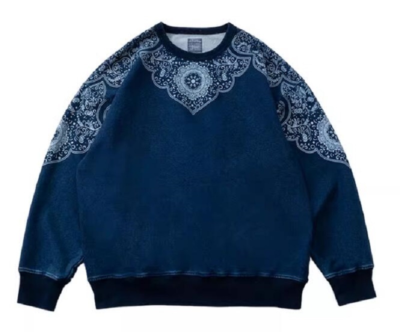 - かっこいい インディゴ染 ブリーチ クルーネック スウェット 本藍染 ペイズリー レトロ S〜2XL ヴィンテージ 大きいサイズ