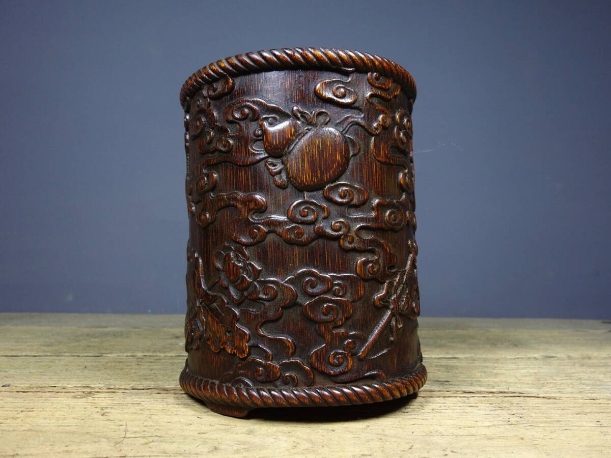 - 【超珍館蔵】竹材 細密彫 八寶紋 筆筒 筆立 文房具 書道品 置物 賞物 古賞物 古董品 古美術品 時代物 旧家蔵出 稀少珍蔵品